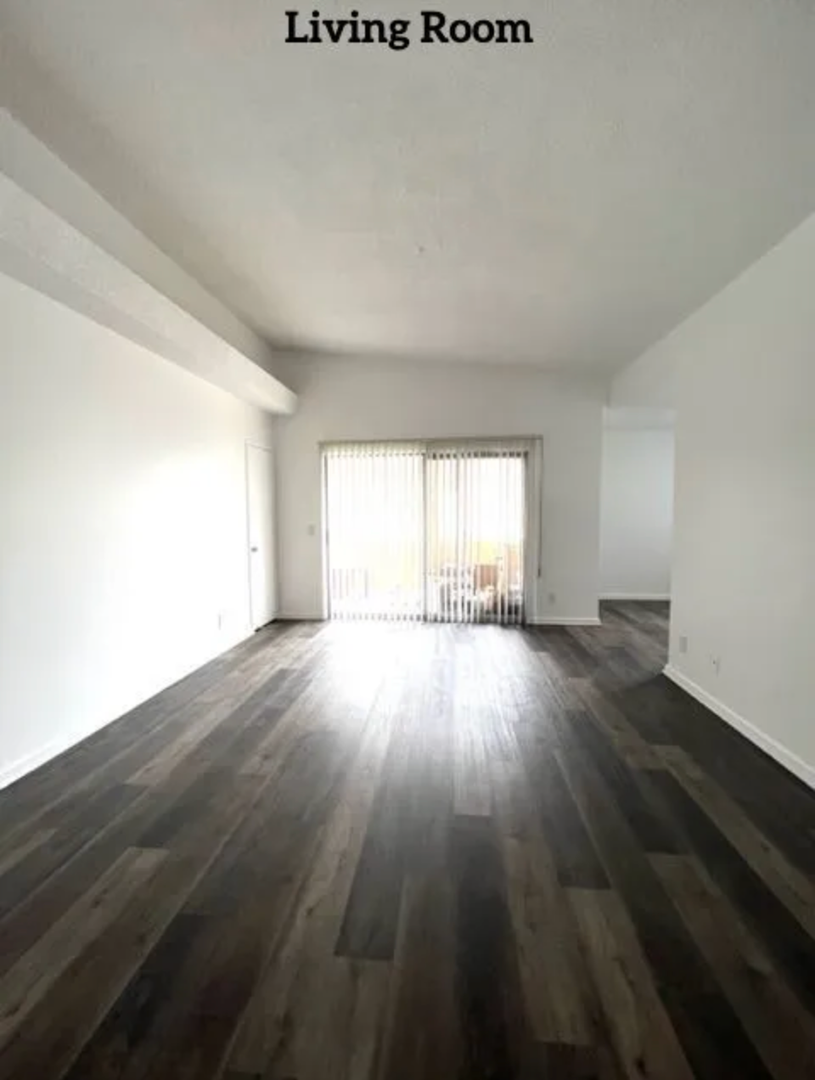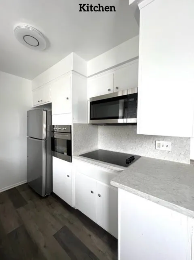Newly renovated apartment that features an open plan layout, hardwood floors, large windows with lots of natural light, a private balcony, and ample cabinet and closet space.