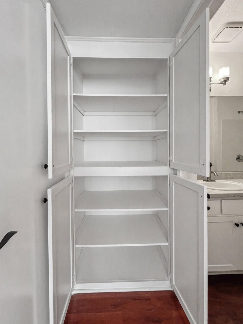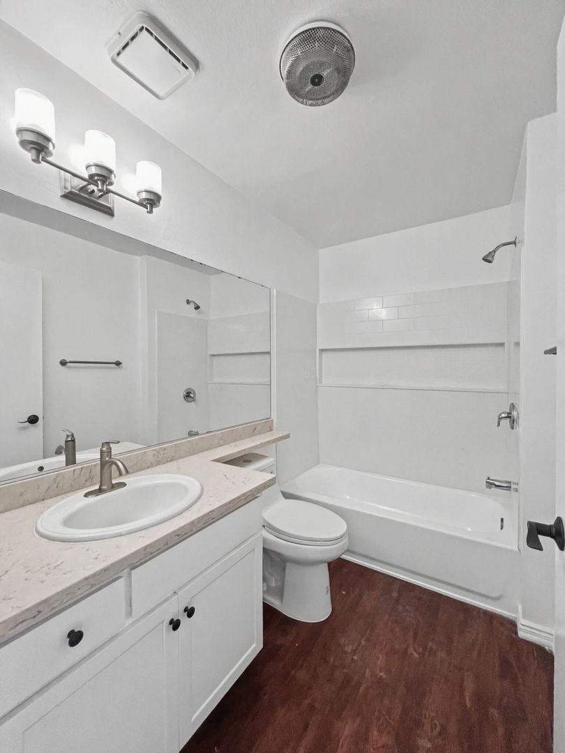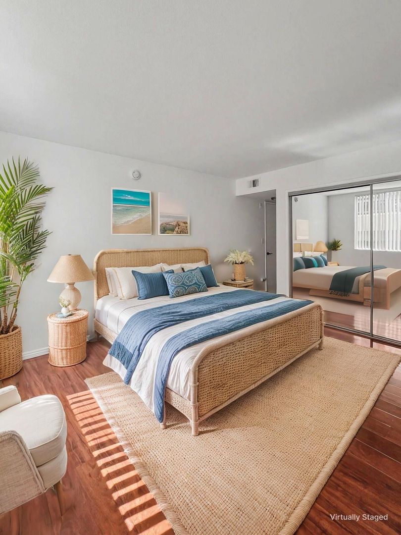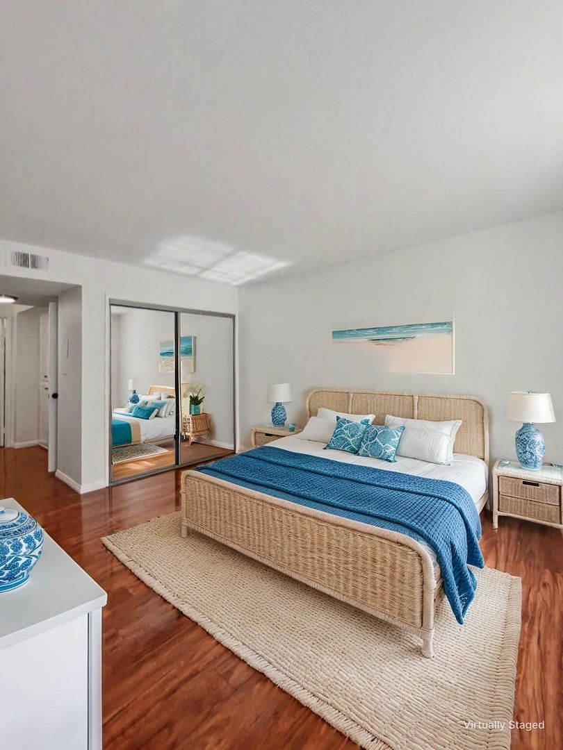 Spacious apartment that features an open plan layout, hardwood floors, large windows with lots of natural light, a private patio balcony, and ample cabinet and closet space in each bedroom.